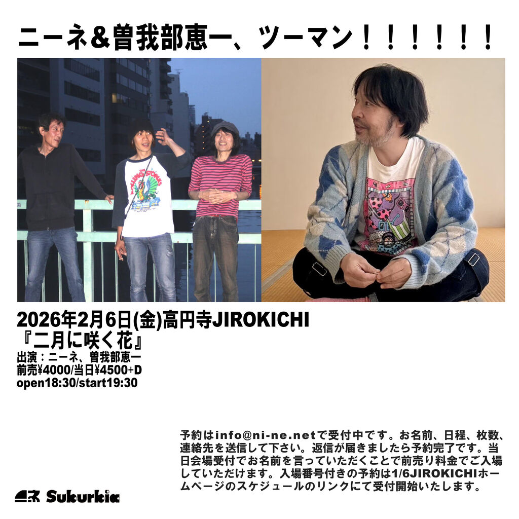 入場番号付きのチケットはJIROKICHIホームページhttps://jirokichi.net/2026/02/06/25393/よりLivepocketで1/9の19:00から予約開始します。入場番号無しでの予約はinfo@ni-ne.netまで「ニーネ2/6予約」のタイトルでお名前、ご連絡先、枚数を送信してください。返信が届きましたら受付完了です。